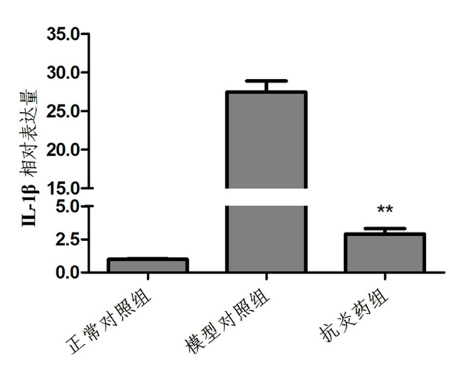 图2. 斑马鱼IL-1β基因相对表达量。(与模型对照组比较,**p < 0.01)