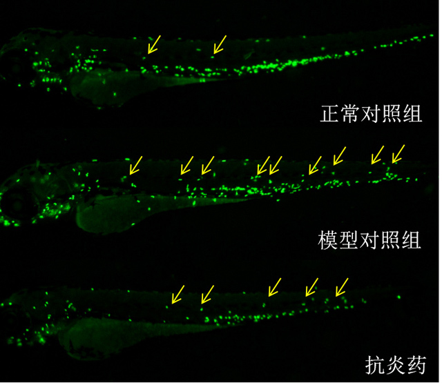 我们将受测试斑马鱼分成三组,分别是正常对照组、模型对照组和服用抗炎药组。其中正常对照组未摄入硫酸铜,模型对照组和服用/注射抗炎药组均摄入硫酸铜(硫酸铜通过溶解到养鱼用水中的方式摄入到斑马鱼体内)。服用/注射抗炎药组在摄入硫酸铜之前摄入吲哚美辛、阿司匹林、布洛芬和双氯芬酸之类的抗炎药。